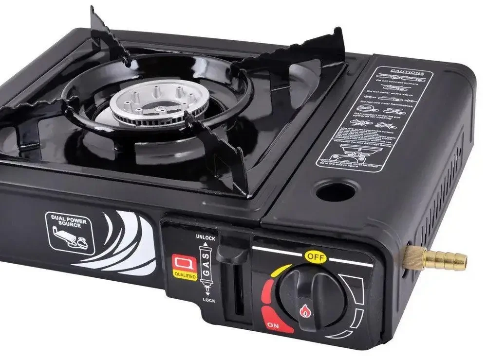 Портативна газова плита подвійної дії з адаптером у кейсі.